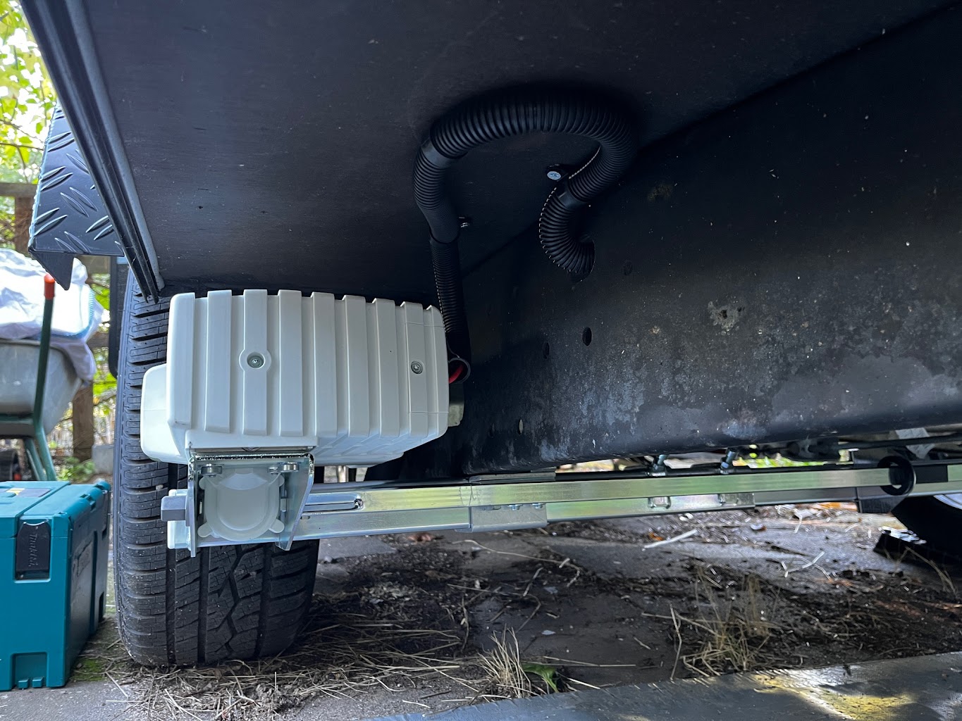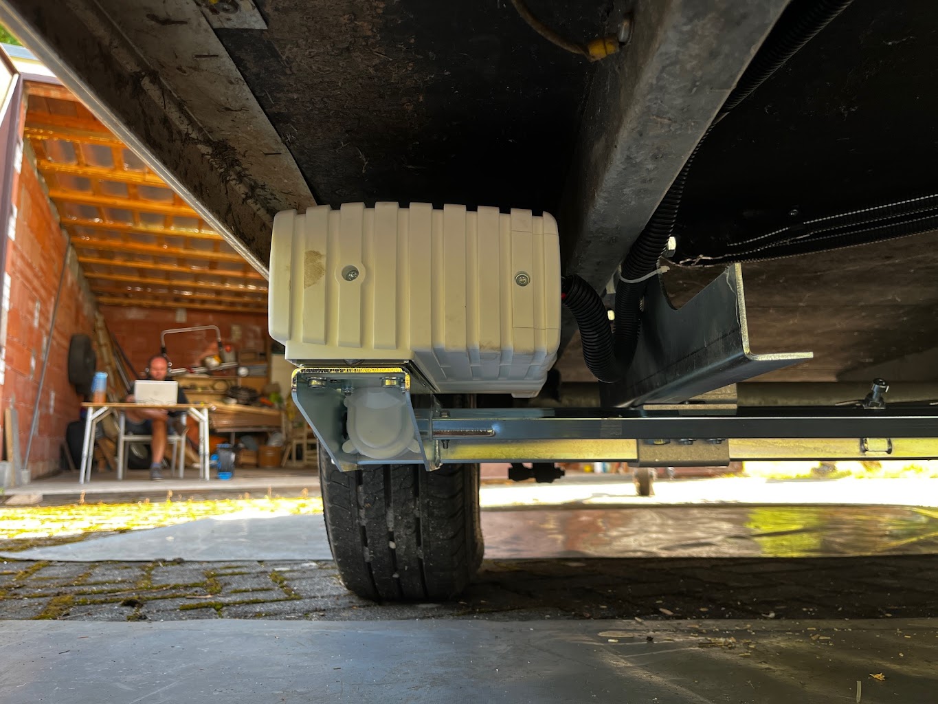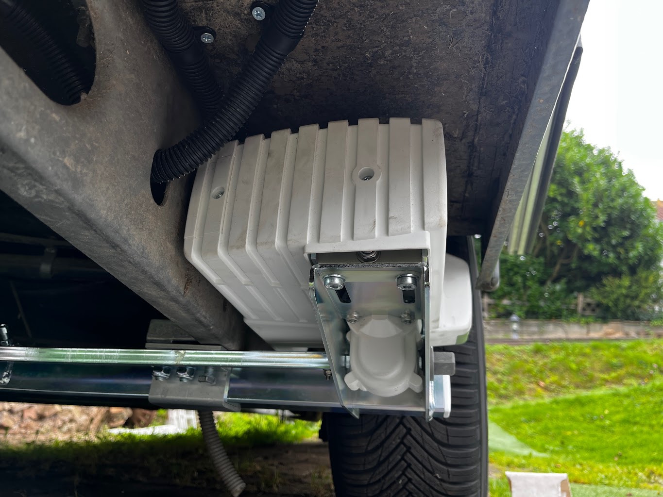 Les pièces métalliques sont galvanisées. Le mover est protégé de manière optimale contre l'humidité, de sorte que le risque de dysfonctionnement est minime lorsqu'il est monté derrière les pneus. Le moteur d'entraînement a 2 Balais. Ce mover a été introduit dans 2021.
